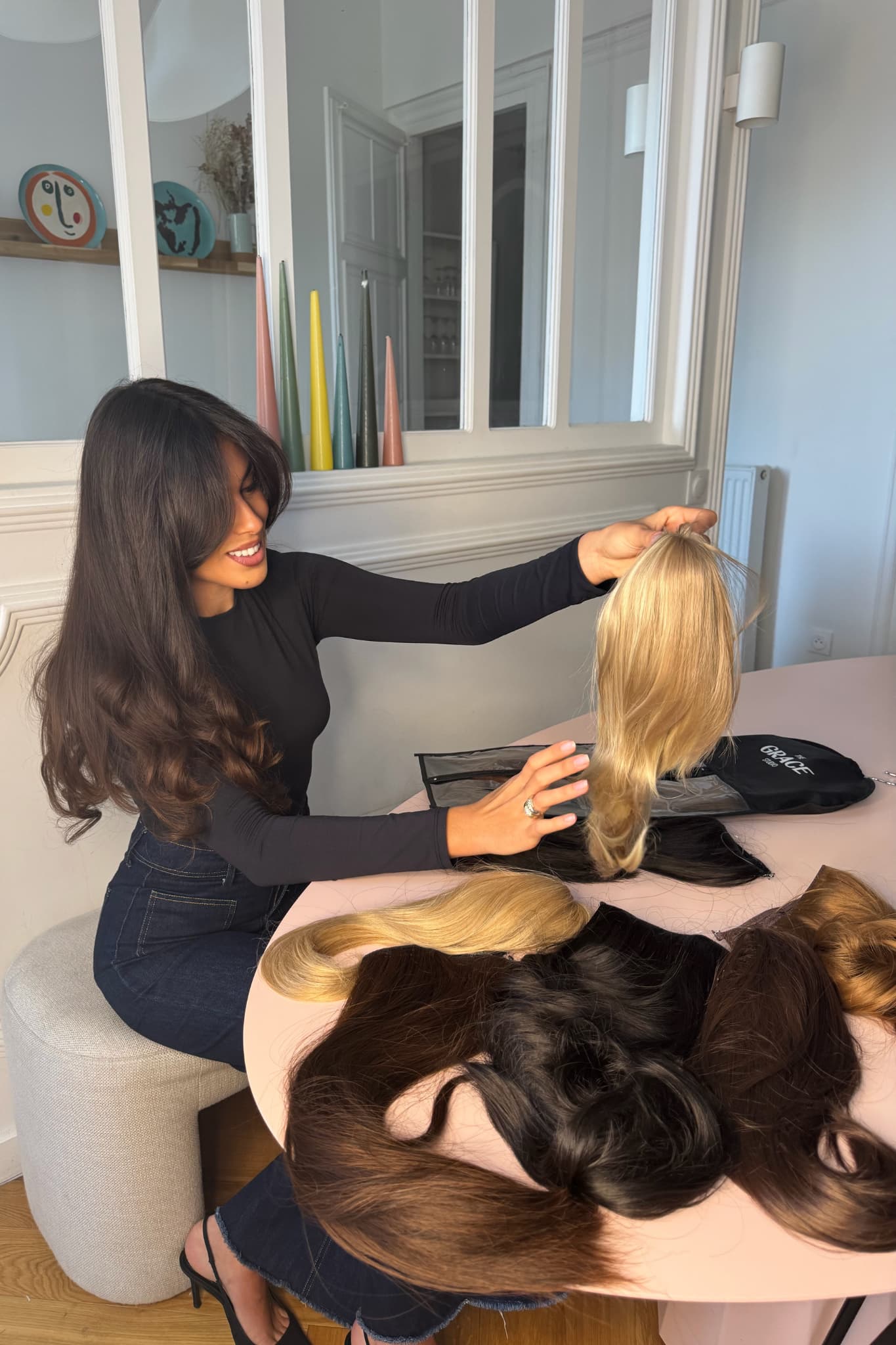 Chaque fibre a été testée dans des conditions réelles, portées, manipulées, observées dans le temps, afin d’identifier celles qui résistaient le mieux à l’usage, qui se fondaient naturellement dans la chevelure et qui reproduisaient avec justesse l’apparence du cheveu naturel.