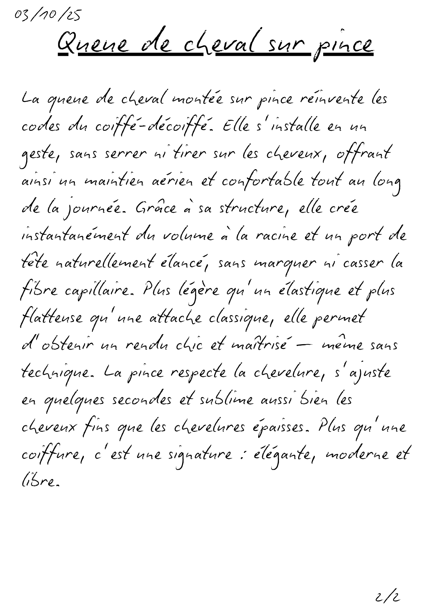 Une matière fluide, un volume maîtrisé, un mouvement naturel. La queue de cheval trouve son équilibre entre tenue et légèreté, pour une allure nette, libre et parfaitement assumée.