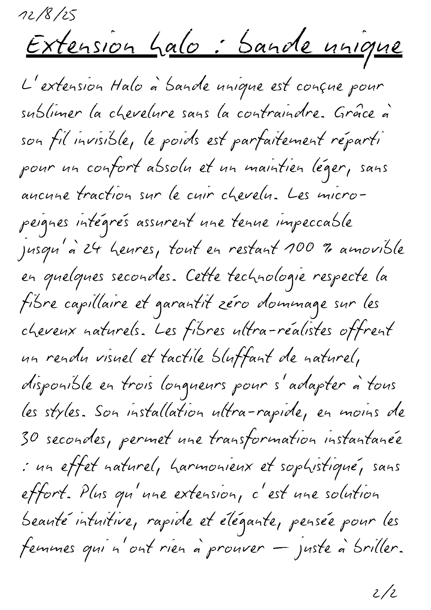 Tout est parti d’un objectif simple : créer une extension qui se fait oublier, tout en transformant la chevelure. À partir des limites des extensions classiques, nous avons imaginé une technologie invisible qui répartit le poids, stabilise la tenue et respecte la chevelure — sans jamais compromettre l’élégance du résultat.